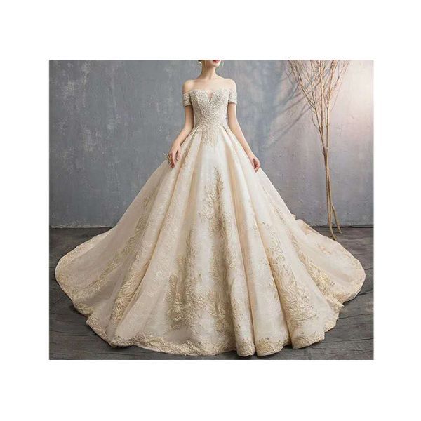 Champagne Off Shoulder Long Tail Bridal Gown Generous Lace Beading Custom Size Images |